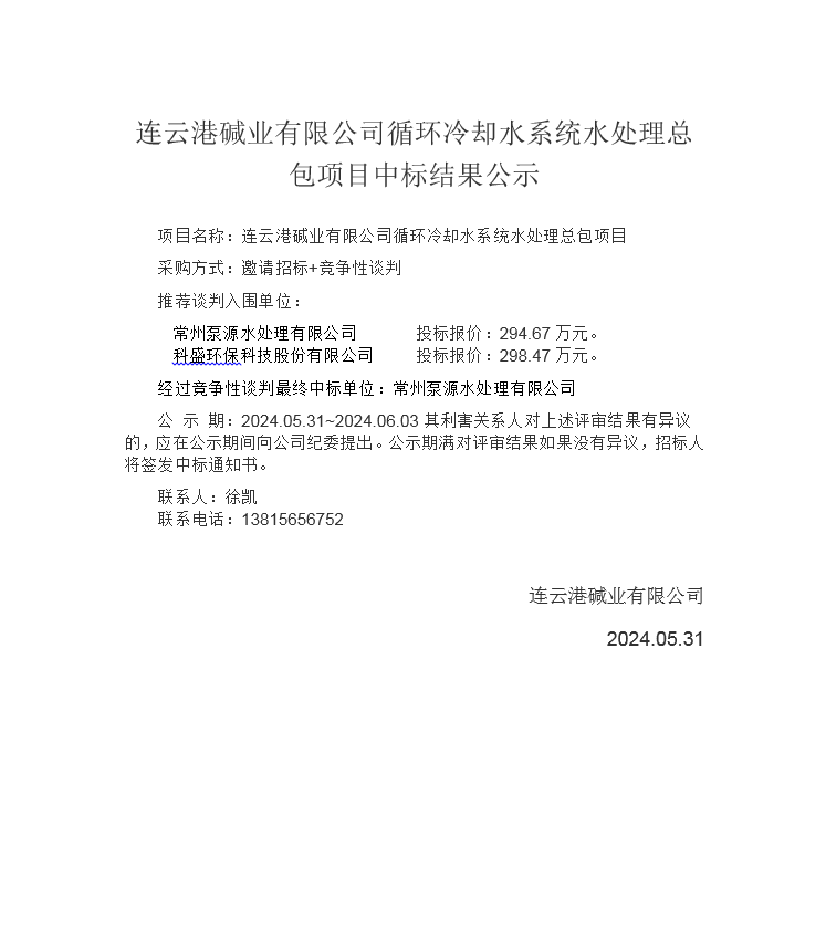 連云港堿業(yè)有限公司循環(huán)冷卻水系統(tǒng)水處理總包項目中標結(jié)果公示