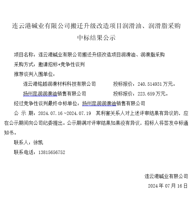 潤滑油、潤滑脂采購中標(biāo)結(jié)果公示
